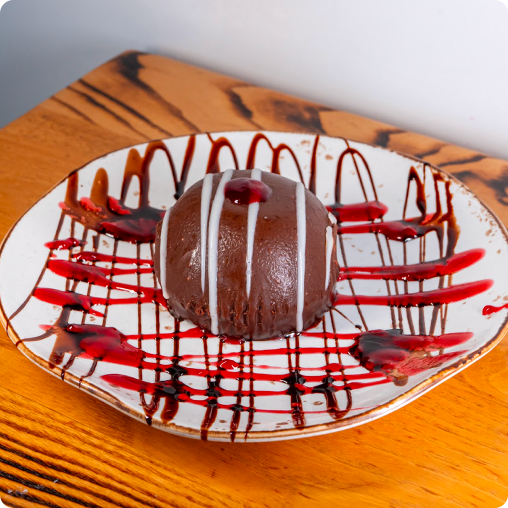 A rich chocolate cake base is layered with milk chocolate & white chocolate mousse and covered in handcrafted chocolate ganache drizzled with white chocolate.