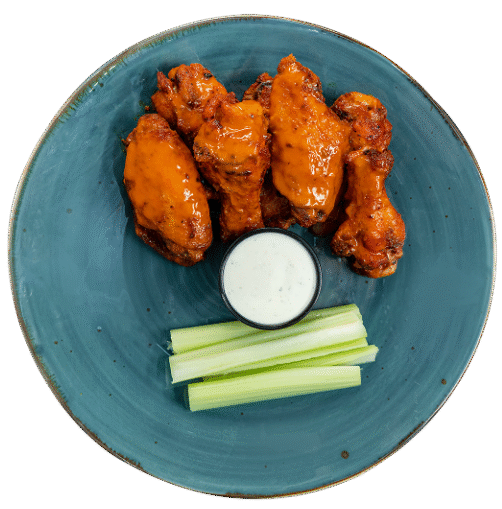 8 Of Our Delicious Marinated Wings Fried Crisp & Tossed In Any One Of Our Wing Sauces, Served W/ Celery & Your Choice Of Ranch Or Blue Cheese.
