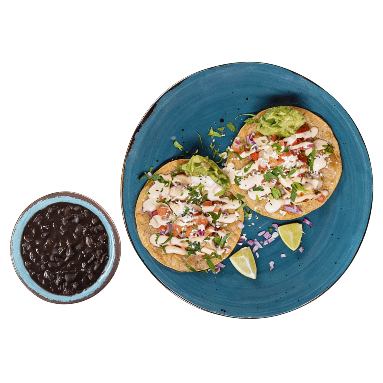 2 corn fried tortillas, topped w/ chipotle cream, guacamole, red onions, queso fresco & your protein choice: fried grouper or chicken