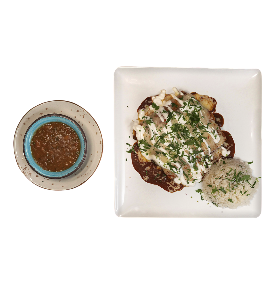 3 Enchiladas Stuffed W/ Choice Of Ground Beef Or Chicken Tinga. Topped W/ Our Rich Enchilada Sauce, Cheese, Sour Cream & Cilantro Served W/ Rice & Charro Beans