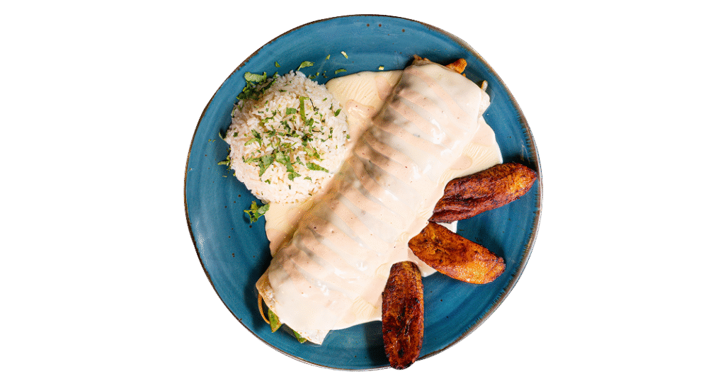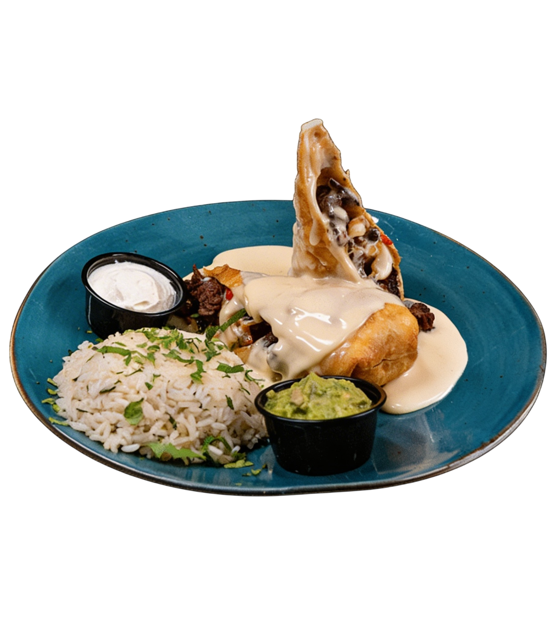 Open end burrito stuffed w/ your choice of marinated fire charred chicken or steak bell peppers, onions & topped w/ cheese dip & drizzled w/ chipotle cream served w/ a side of rice & plantains