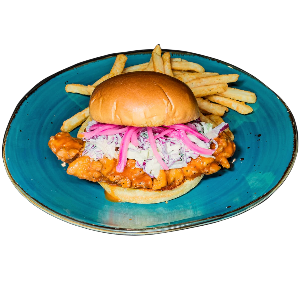 Our Marinated Chicken Breast Fried Golden Brown Tossed In Hot Honey Garlic Sauce & Topped W/ Slaw & Onions On Brioche
