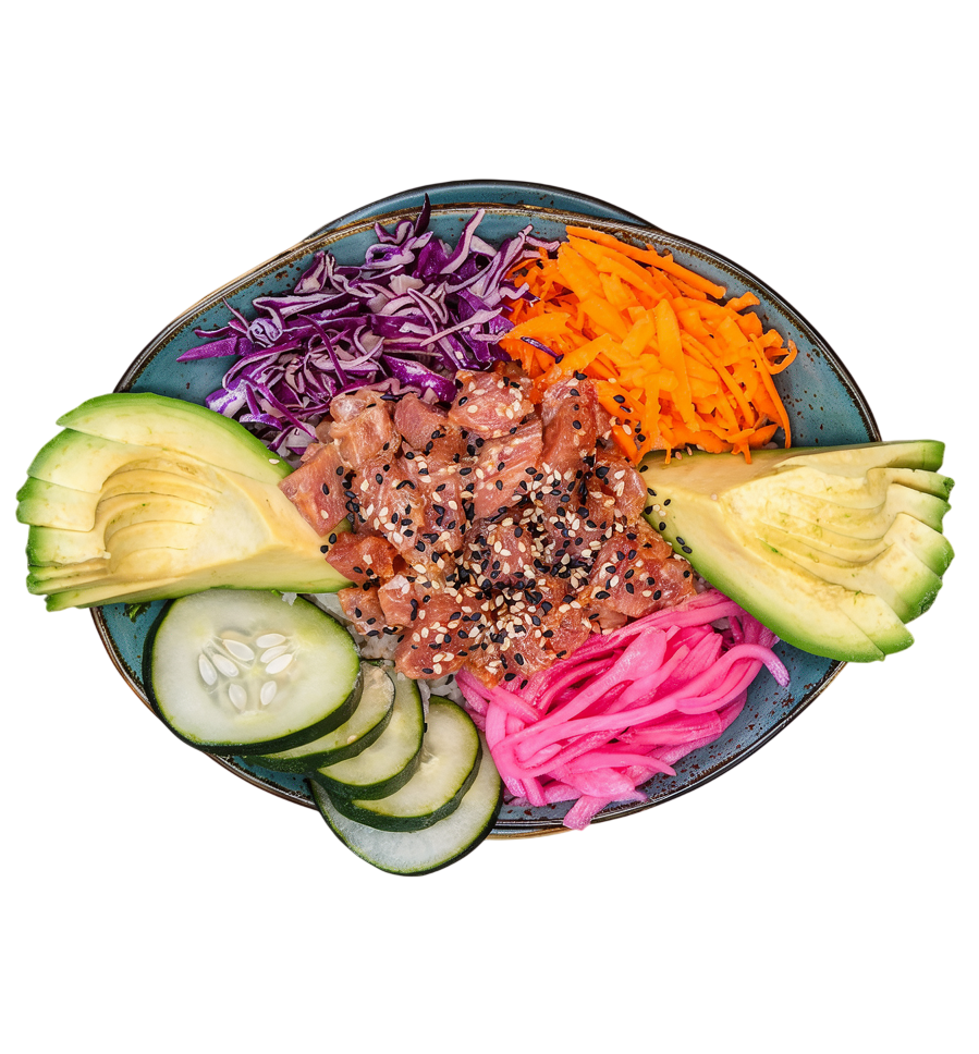 Sushi Grade Tuna* Tossed In Sriracha Aioli & Unagi Sauce On Top Of Rice & Served W/ Cucumber Salad, Avocado Carrots Red Cabbage, Onion & Sesame